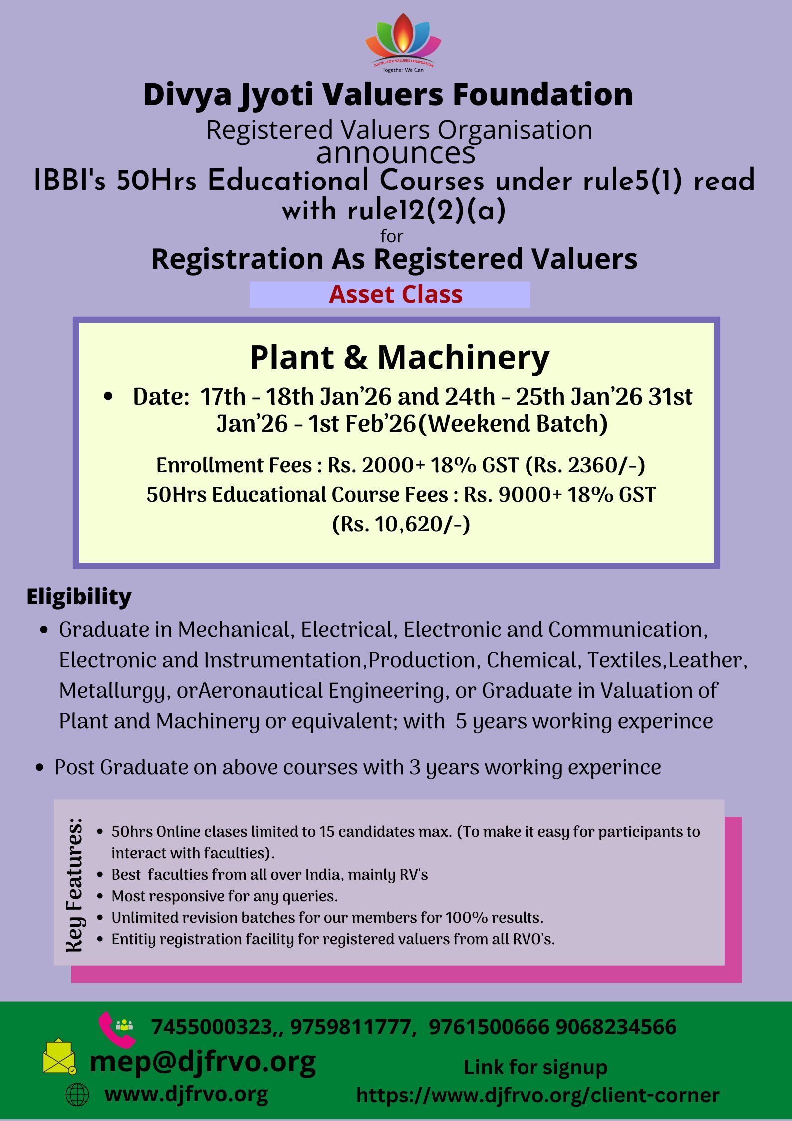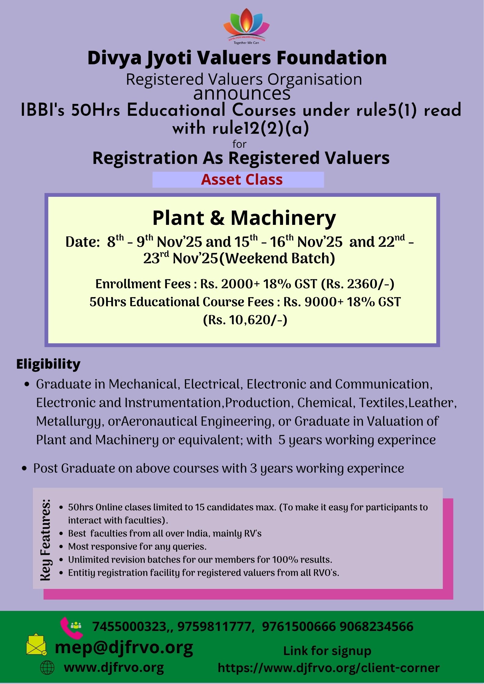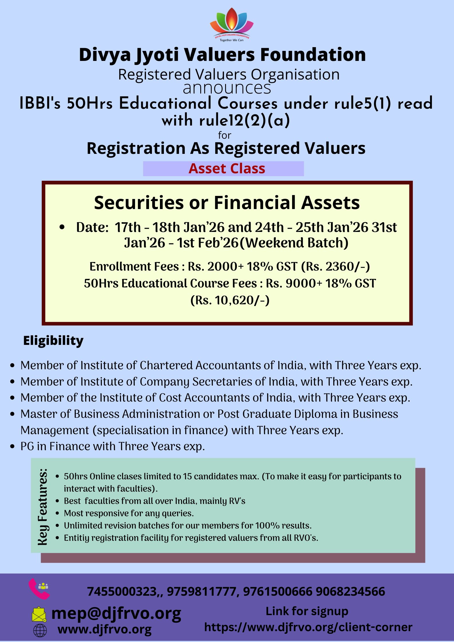 Divya Jyoti Valuers Foundation Registered Valuers Organisation Divya Jyoti Valuers Foundation (DJVF) is a company registered under the Companies Act 2013. DJVF has been recognized as Registered Valuers Organisation (RVO) by Insolvency and bankruptcy board of India(IBBI).It enrolls eligible professionals as its members. It is engaged in the development of the valuation profession and promotes the continuous professional development of its members. It monitors and regulates the activities of its member registered valuers and continuously improves upon its internal regulations and guidelines to ensure that the high standard of professional and ethical conduct is maintained by its members. It has been approved by IBBI under following all three classes of Assets: 1. Land & Building 2. Plant & Machinery 3. Securities or Financial Assets A professional who would like to pursue valuation profession as his or her career, has to undergo 50 Hrs Compulsory Educational Program conducted by RVO as per the syllabus provided by IBBI, in the category chosen by him/her to become a Registered Valuer according to Section 247, of The Companies Act, 2013.We at DJVF RVO are conducting the above course at various centers indicated in this website. As permitted by IBBI in view of the Covid pandemic, we are conducting online classes for 50hrs Mandatory Educational programme (MEP), f