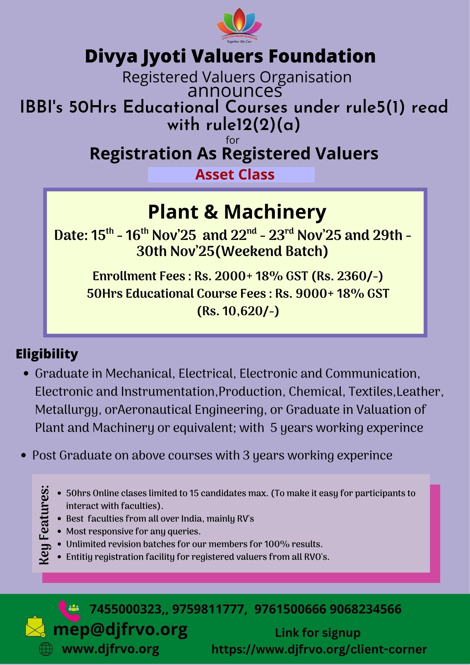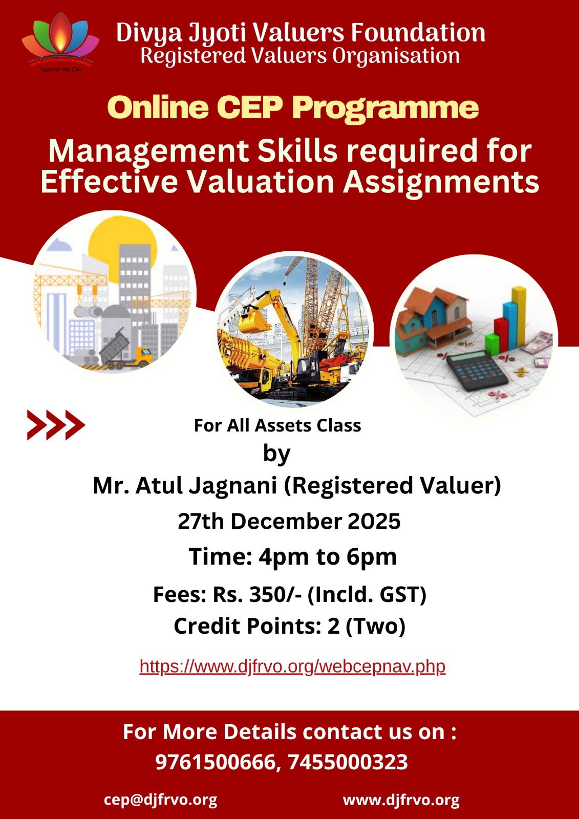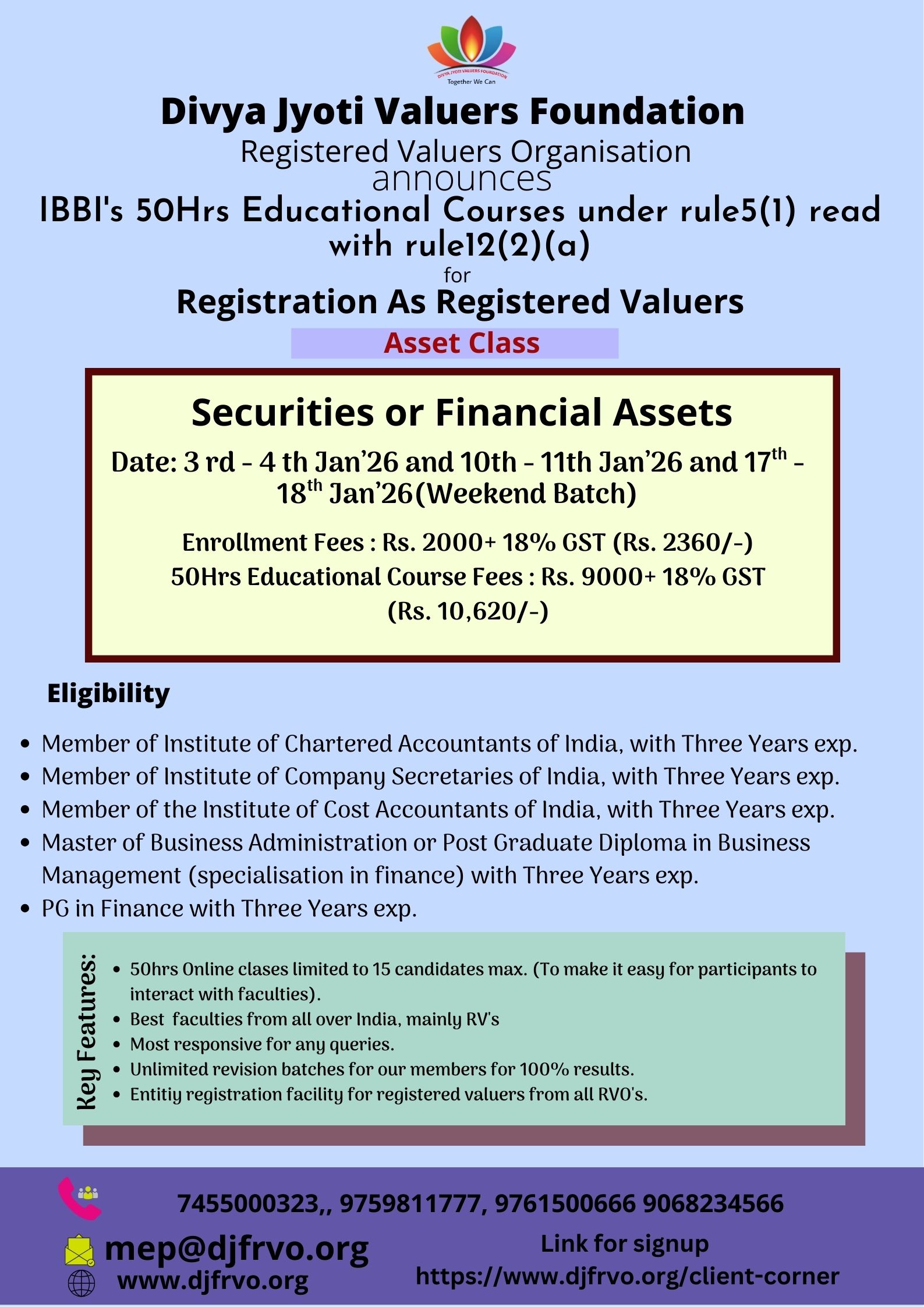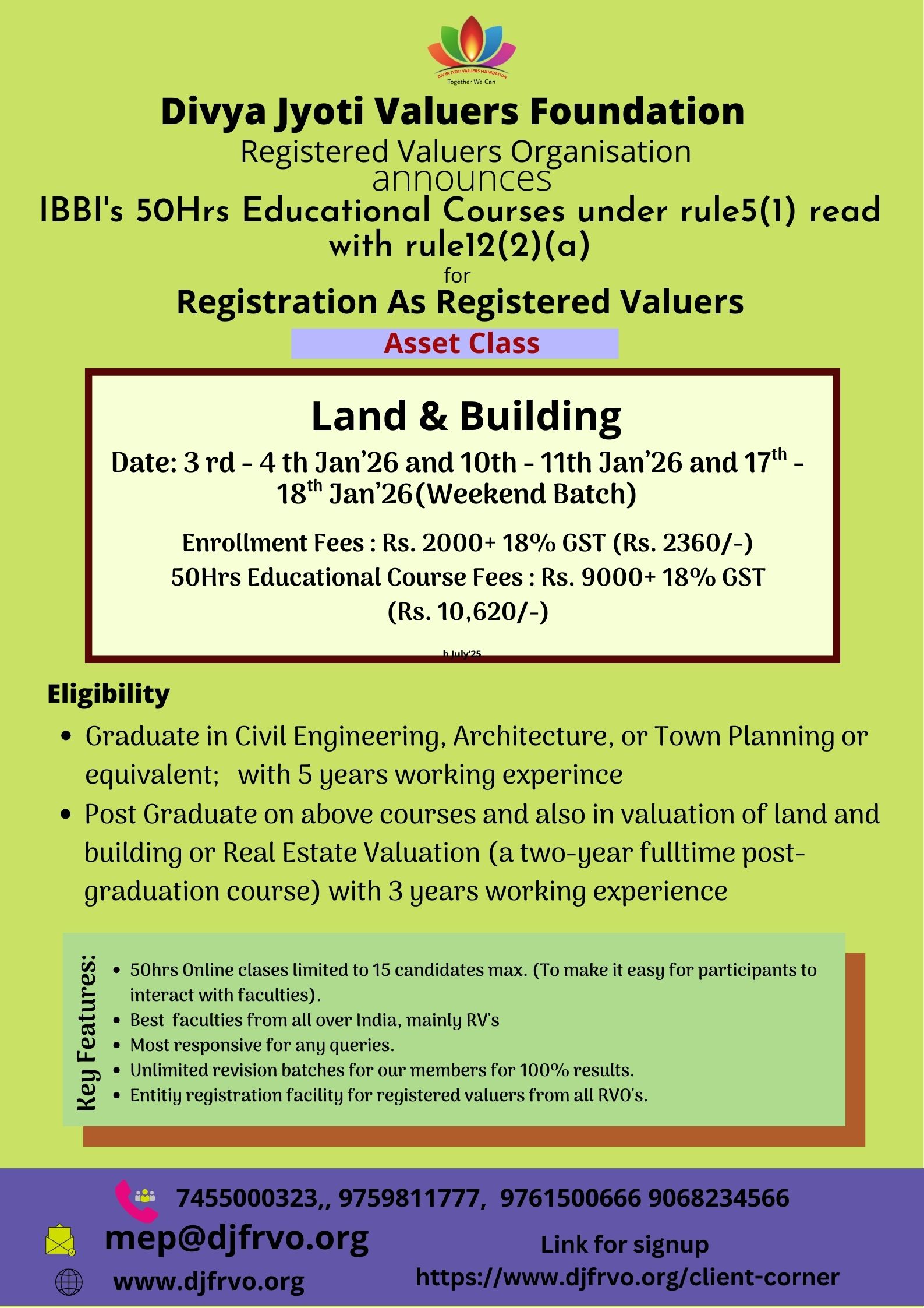 Divya Jyoti Valuers Foundation Registered Valuers Organisation Divya Jyoti Valuers Foundation (DJVF) is a company registered under the Companies Act 2013. DJVF has been recognized as Registered Valuers Organisation (RVO) by Insolvency and bankruptcy board of India(IBBI).It enrolls eligible professionals as its members. It is engaged in the development of the valuation profession and promotes the continuous professional development of its members. It monitors and regulates the activities of its member registered valuers and continuously improves upon its internal regulations and guidelines to ensure that the high standard of professional and ethical conduct is maintained by its members. It has been approved by IBBI under following all three classes of Assets: 1. Land & Building 2. Plant & Machinery 3. Securities or Financial Assets A professional who would like to pursue valuation profession as his or her career, has to undergo 50 Hrs Compulsory Educational Program conducted by RVO as per the syllabus provided by IBBI, in the category chosen by him/her to become a Registered Valuer according to Section 247, of The Companies Act, 2013.We at DJVF RVO are conducting the above course at various centers indicated in this website. As permitted by IBBI in view of the Covid pandemic, we are conducting online classes for 50hrs Mandatory Educational programme (MEP), f