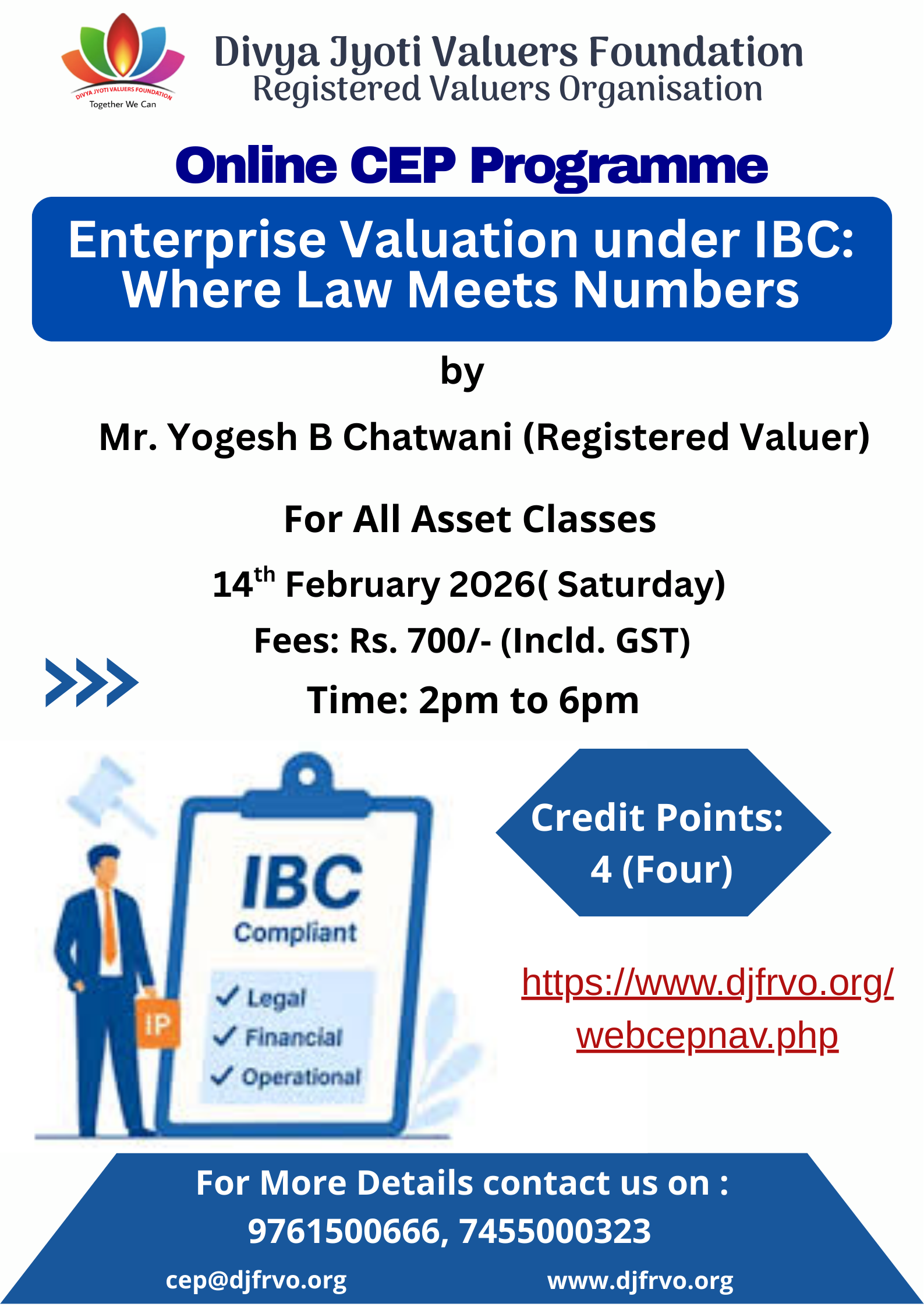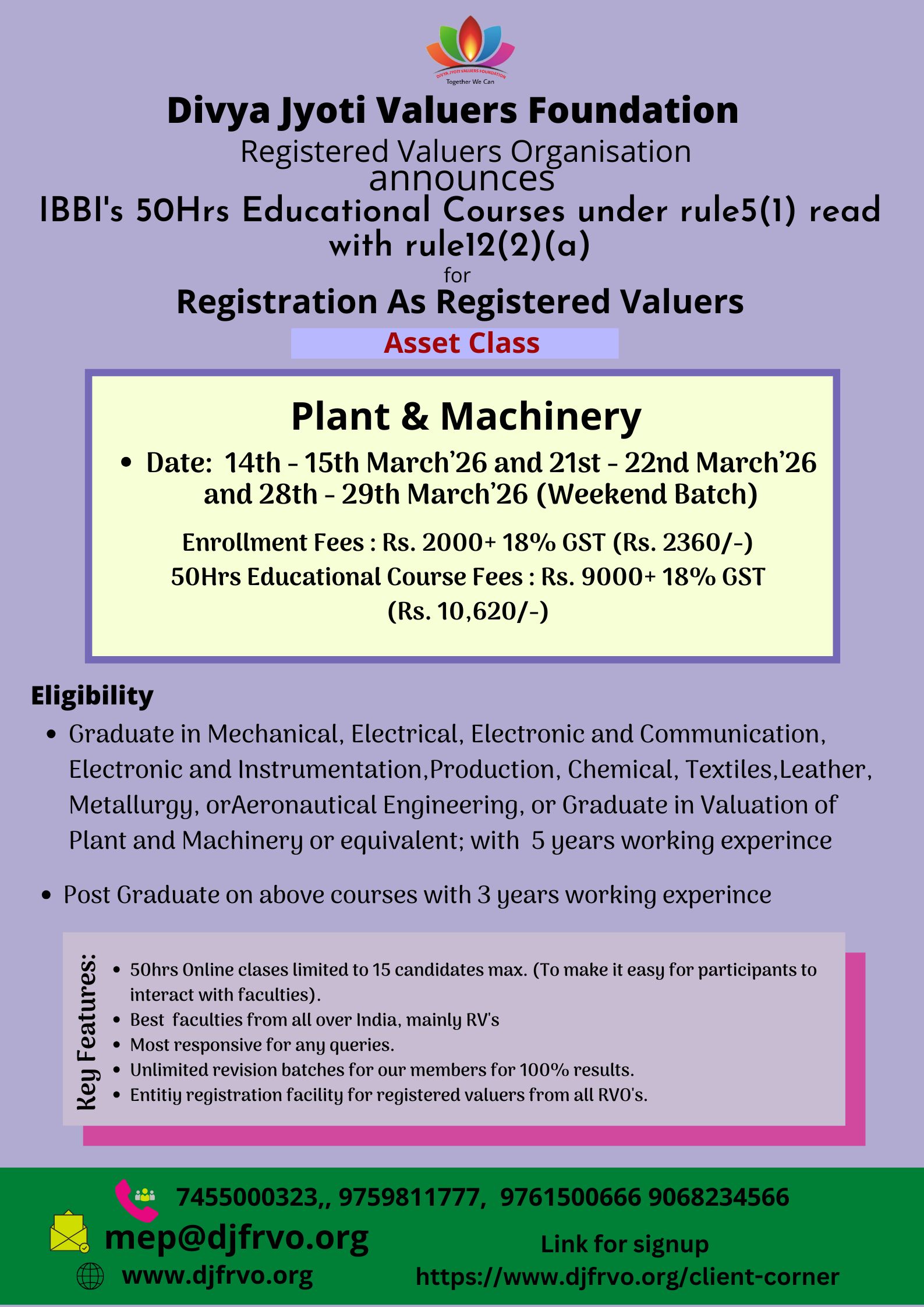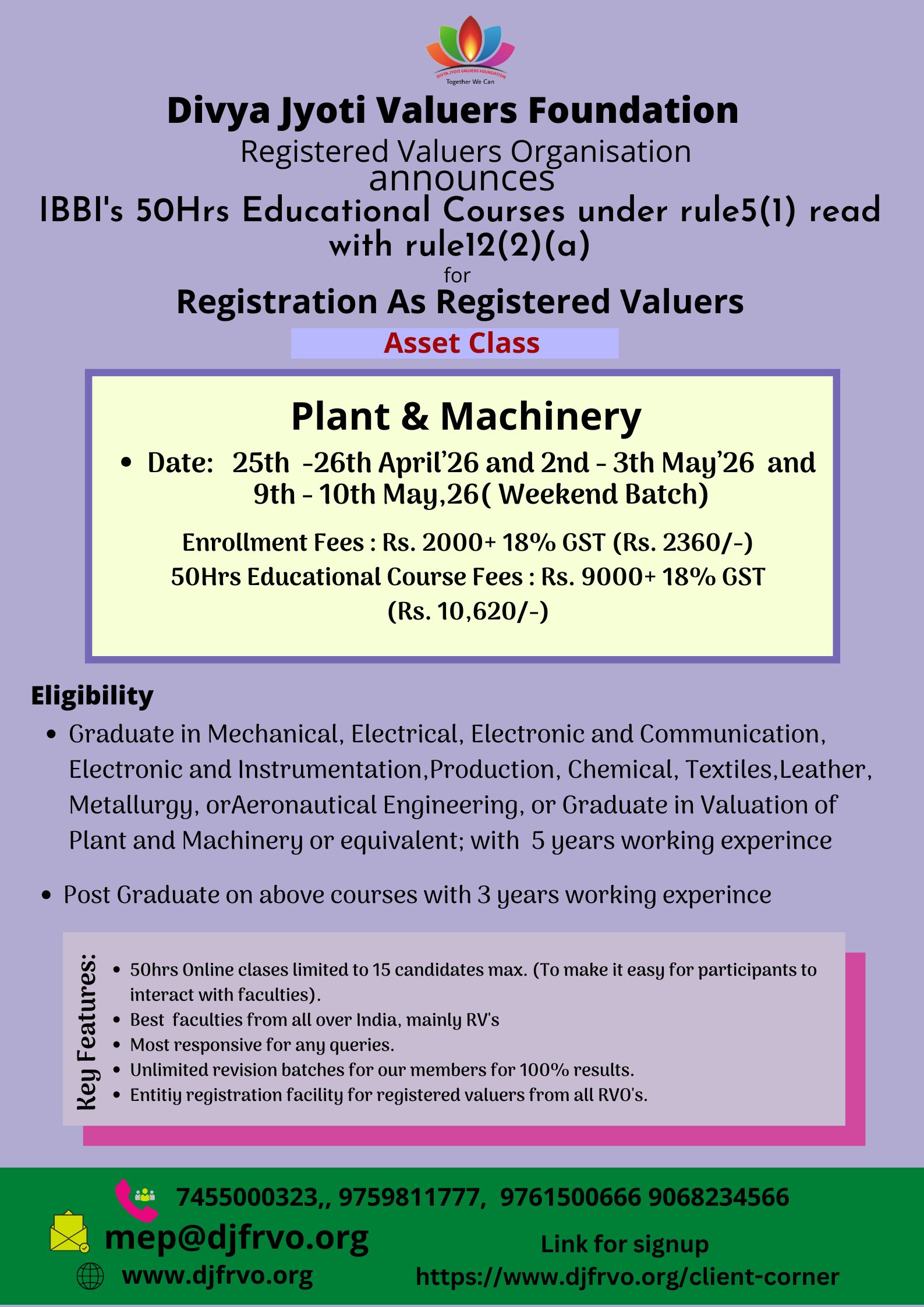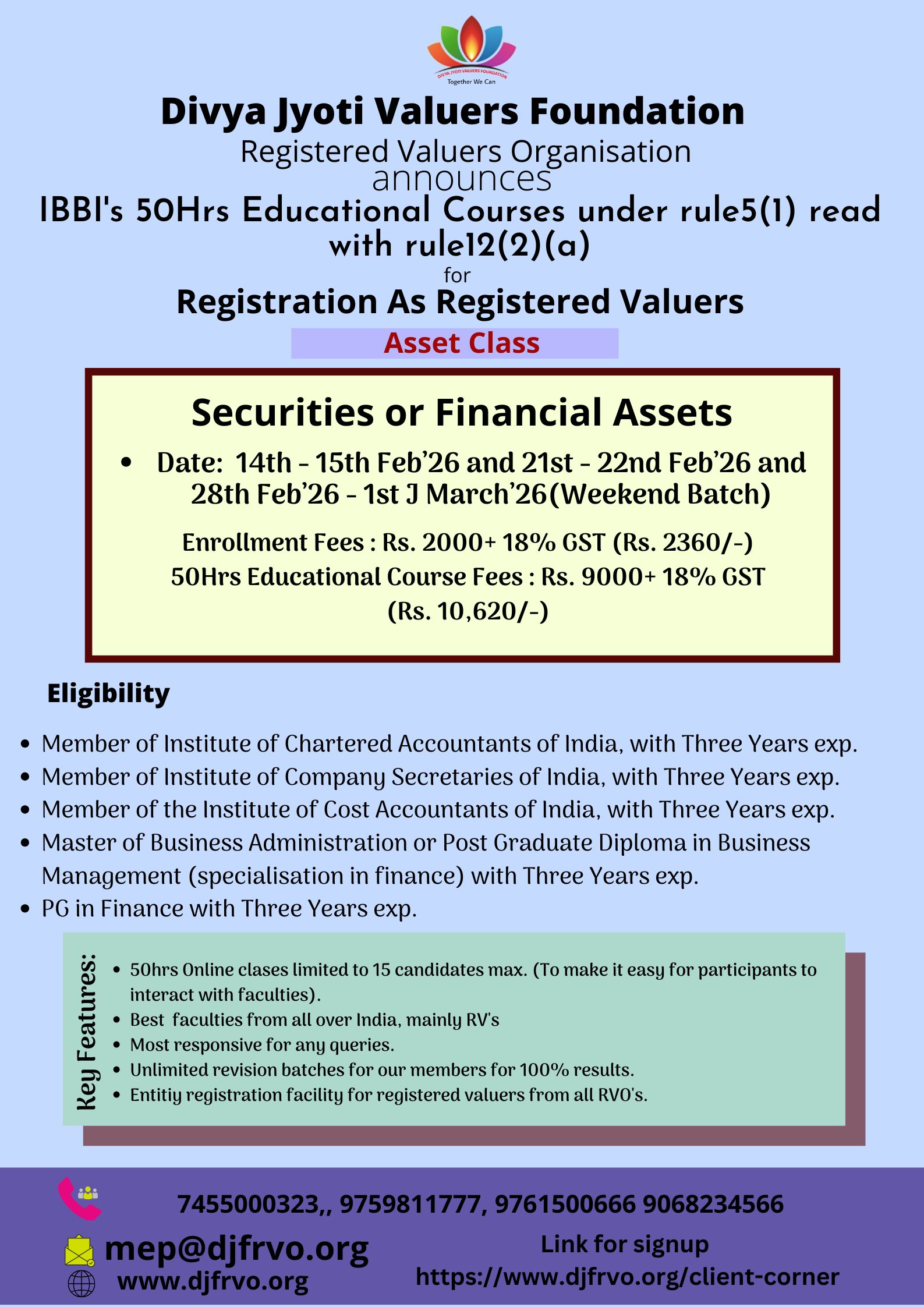 Divya Jyoti Valuers Foundation Registered Valuers Organisation Divya Jyoti Valuers Foundation (DJVF) is a company registered under the Companies Act 2013. DJVF has been recognized as Registered Valuers Organisation (RVO) by Insolvency and bankruptcy board of India(IBBI).It enrolls eligible professionals as its members. It is engaged in the development of the valuation profession and promotes the continuous professional development of its members. It monitors and regulates the activities of its member registered valuers and continuously improves upon its internal regulations and guidelines to ensure that the high standard of professional and ethical conduct is maintained by its members. It has been approved by IBBI under following all three classes of Assets: 1. Land & Building 2. Plant & Machinery 3. Securities or Financial Assets A professional who would like to pursue valuation profession as his or her career, has to undergo 50 Hrs Compulsory Educational Program conducted by RVO as per the syllabus provided by IBBI, in the category chosen by him/her to become a Registered Valuer according to Section 247, of The Companies Act, 2013.We at DJVF RVO are conducting the above course at various centers indicated in this website. As permitted by IBBI in view of the Covid pandemic, we are conducting online classes for 50hrs Mandatory Educational programme (MEP), f
