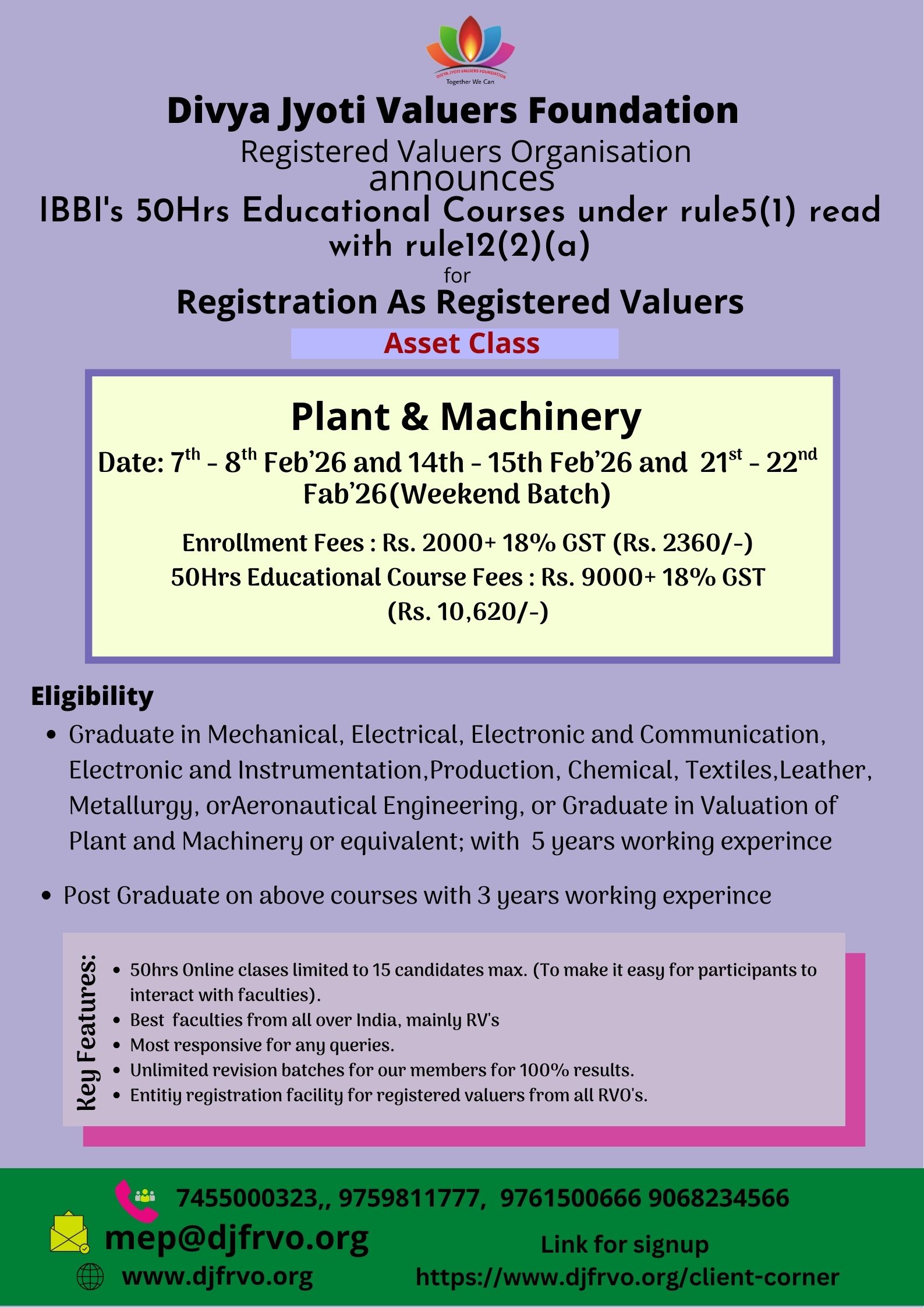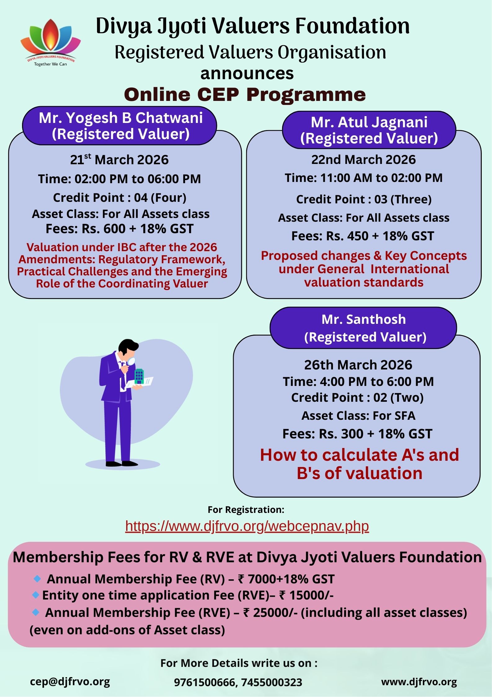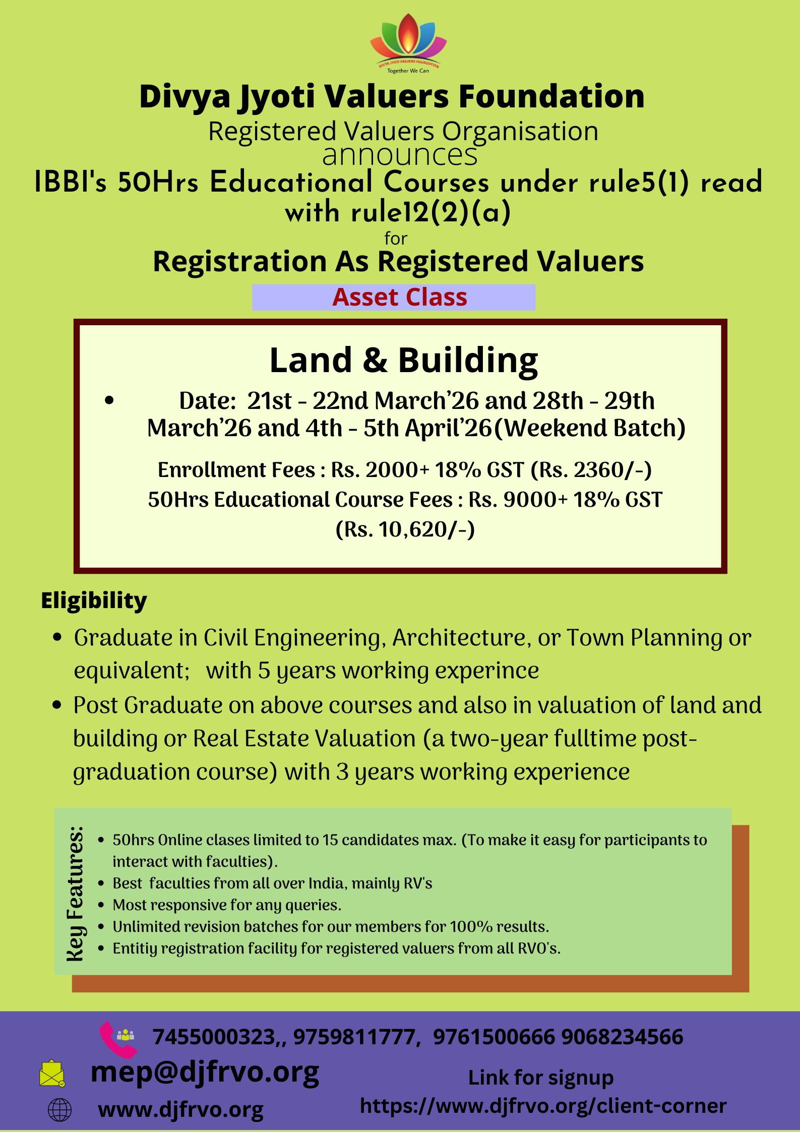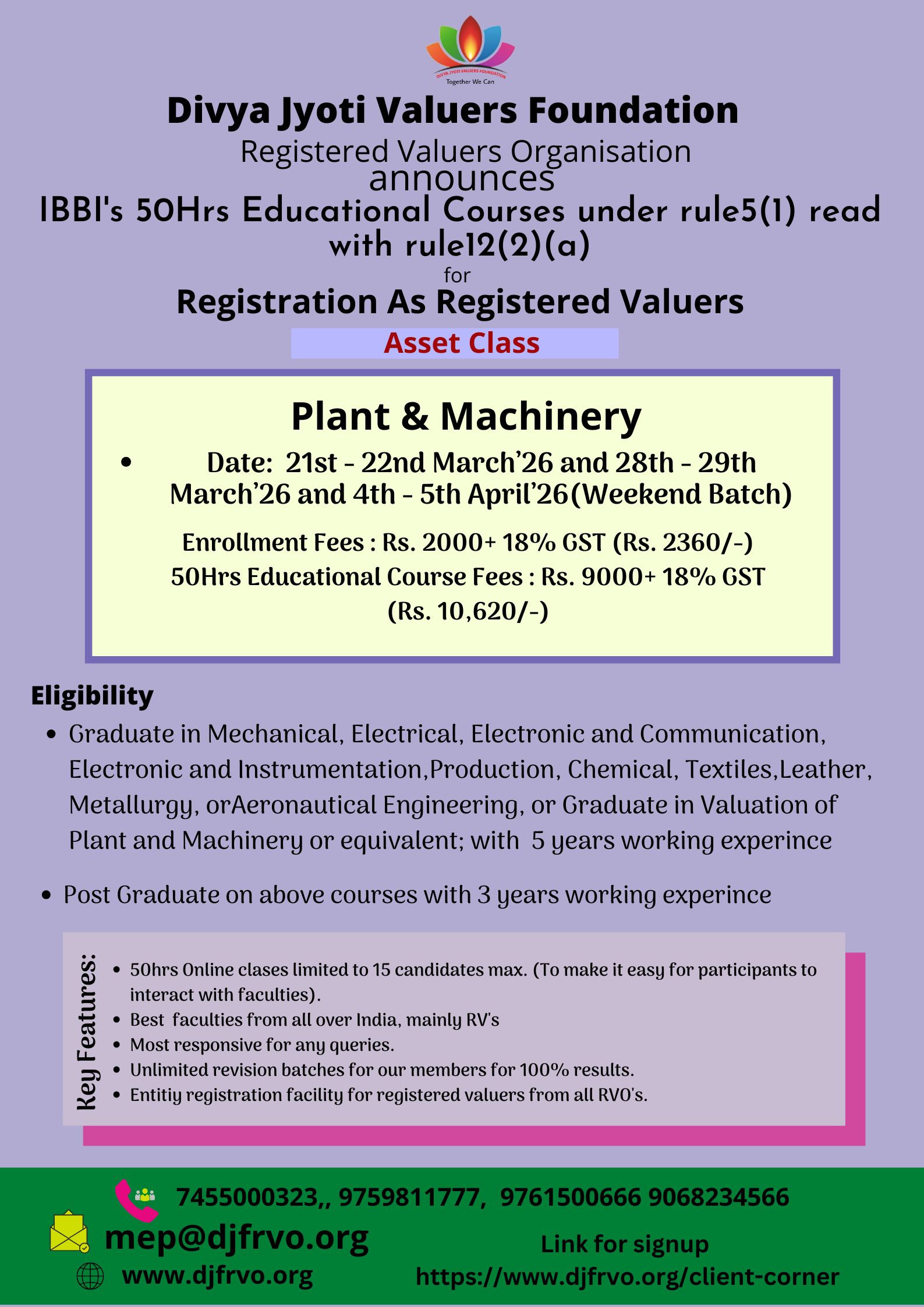 Divya Jyoti Valuers Foundation Registered Valuers Organisation Divya Jyoti Valuers Foundation (DJVF) is a company registered under the Companies Act 2013. DJVF has been recognized as Registered Valuers Organisation (RVO) by Insolvency and bankruptcy board of India(IBBI).It enrolls eligible professionals as its members. It is engaged in the development of the valuation profession and promotes the continuous professional development of its members. It monitors and regulates the activities of its member registered valuers and continuously improves upon its internal regulations and guidelines to ensure that the high standard of professional and ethical conduct is maintained by its members. It has been approved by IBBI under following all three classes of Assets: 1. Land & Building 2. Plant & Machinery 3. Securities or Financial Assets A professional who would like to pursue valuation profession as his or her career, has to undergo 50 Hrs Compulsory Educational Program conducted by RVO as per the syllabus provided by IBBI, in the category chosen by him/her to become a Registered Valuer according to Section 247, of The Companies Act, 2013.We at DJVF RVO are conducting the above course at various centers indicated in this website. As permitted by IBBI in view of the Covid pandemic, we are conducting online classes for 50hrs Mandatory Educational programme (MEP), f