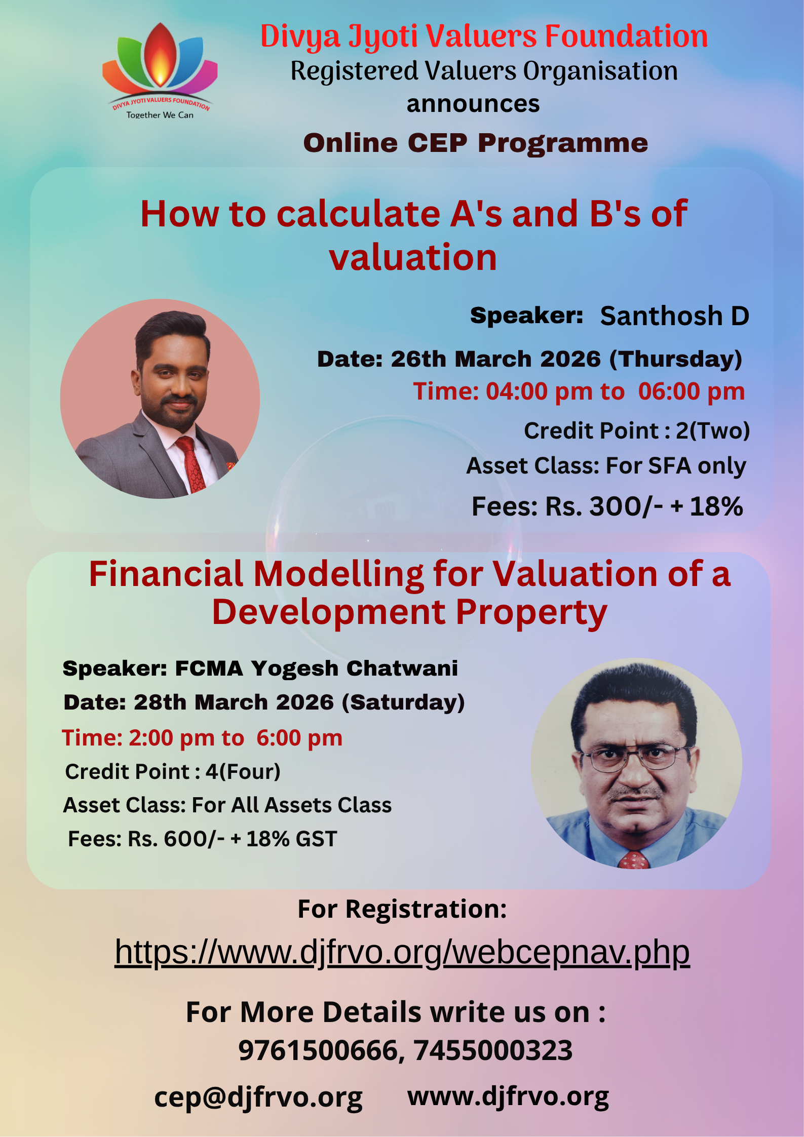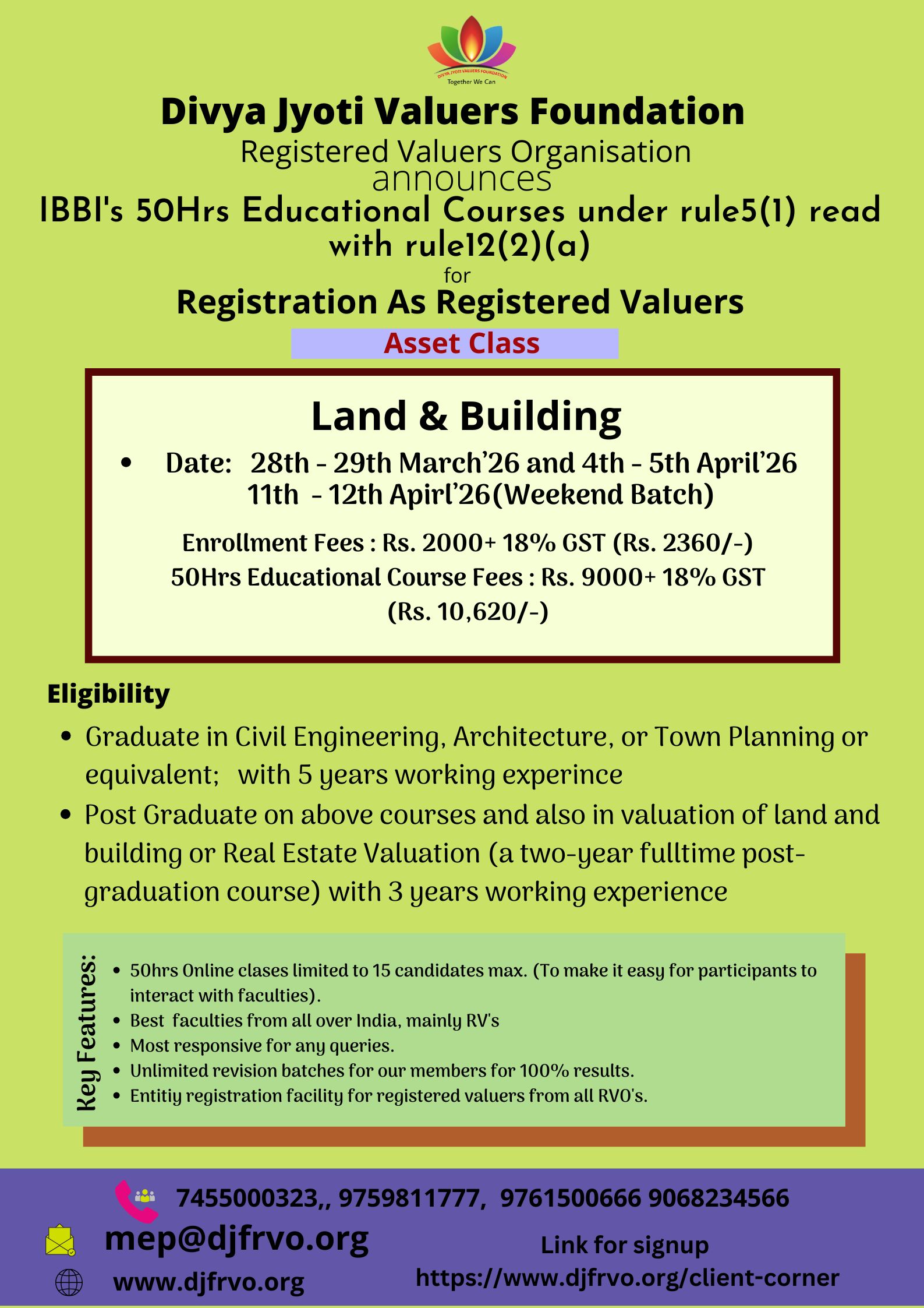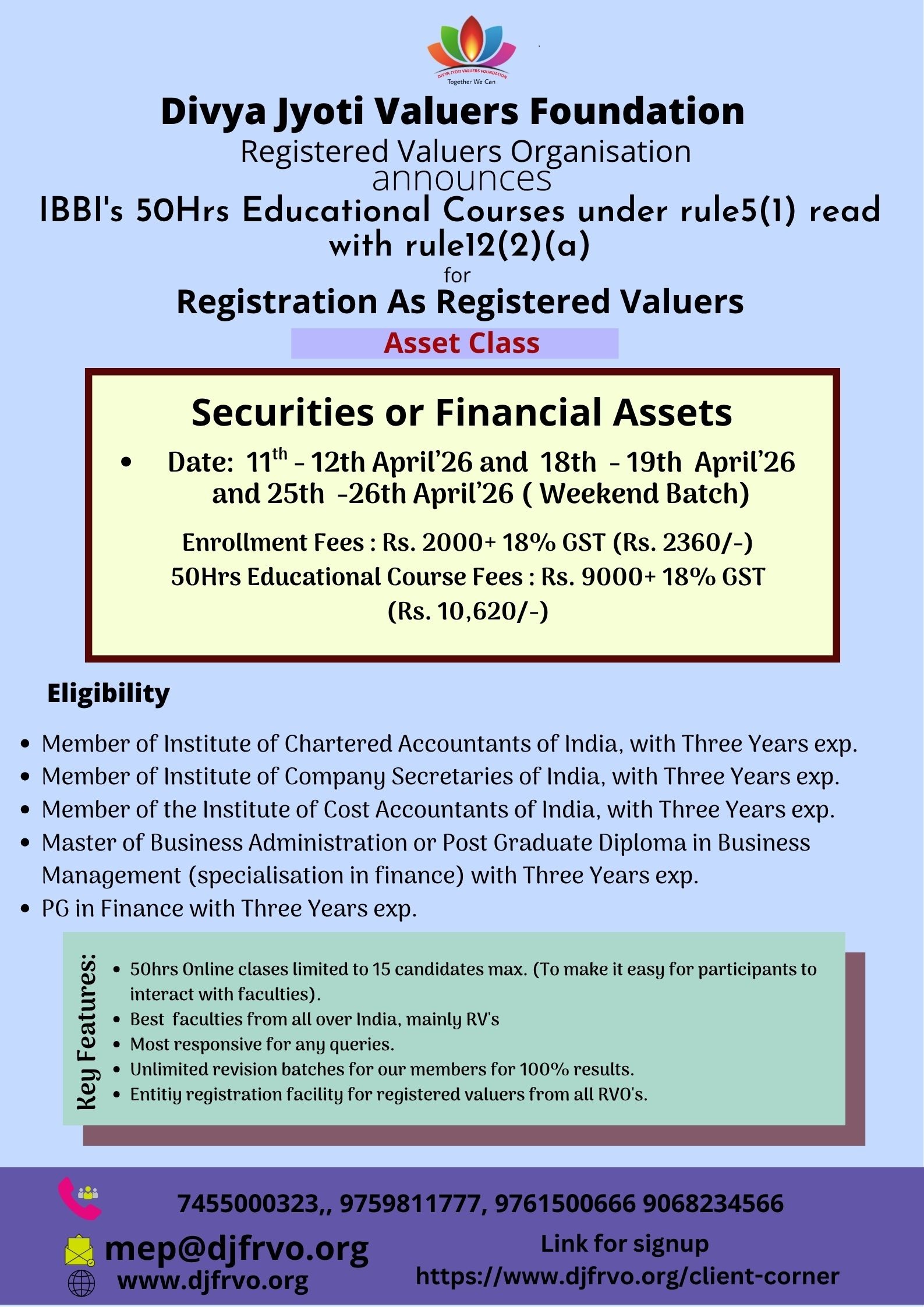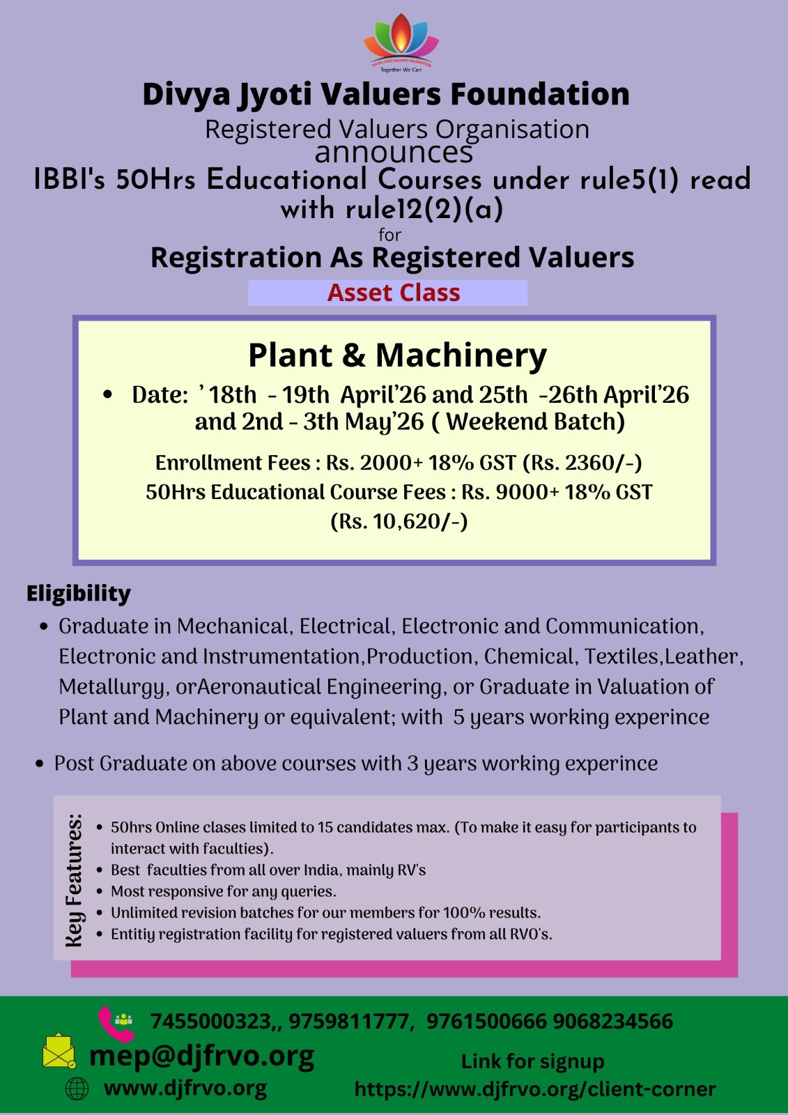 Divya Jyoti Valuers Foundation Registered Valuers Organisation Divya Jyoti Valuers Foundation (DJVF) is a company registered under the Companies Act 2013. DJVF has been recognized as Registered Valuers Organisation (RVO) by Insolvency and bankruptcy board of India(IBBI).It enrolls eligible professionals as its members. It is engaged in the development of the valuation profession and promotes the continuous professional development of its members. It monitors and regulates the activities of its member registered valuers and continuously improves upon its internal regulations and guidelines to ensure that the high standard of professional and ethical conduct is maintained by its members. It has been approved by IBBI under following all three classes of Assets: 1. Land & Building 2. Plant & Machinery 3. Securities or Financial Assets A professional who would like to pursue valuation profession as his or her career, has to undergo 50 Hrs Compulsory Educational Program conducted by RVO as per the syllabus provided by IBBI, in the category chosen by him/her to become a Registered Valuer according to Section 247, of The Companies Act, 2013.We at DJVF RVO are conducting the above course at various centers indicated in this website. As permitted by IBBI in view of the Covid pandemic, we are conducting online classes for 50hrs Mandatory Educational programme (MEP), f