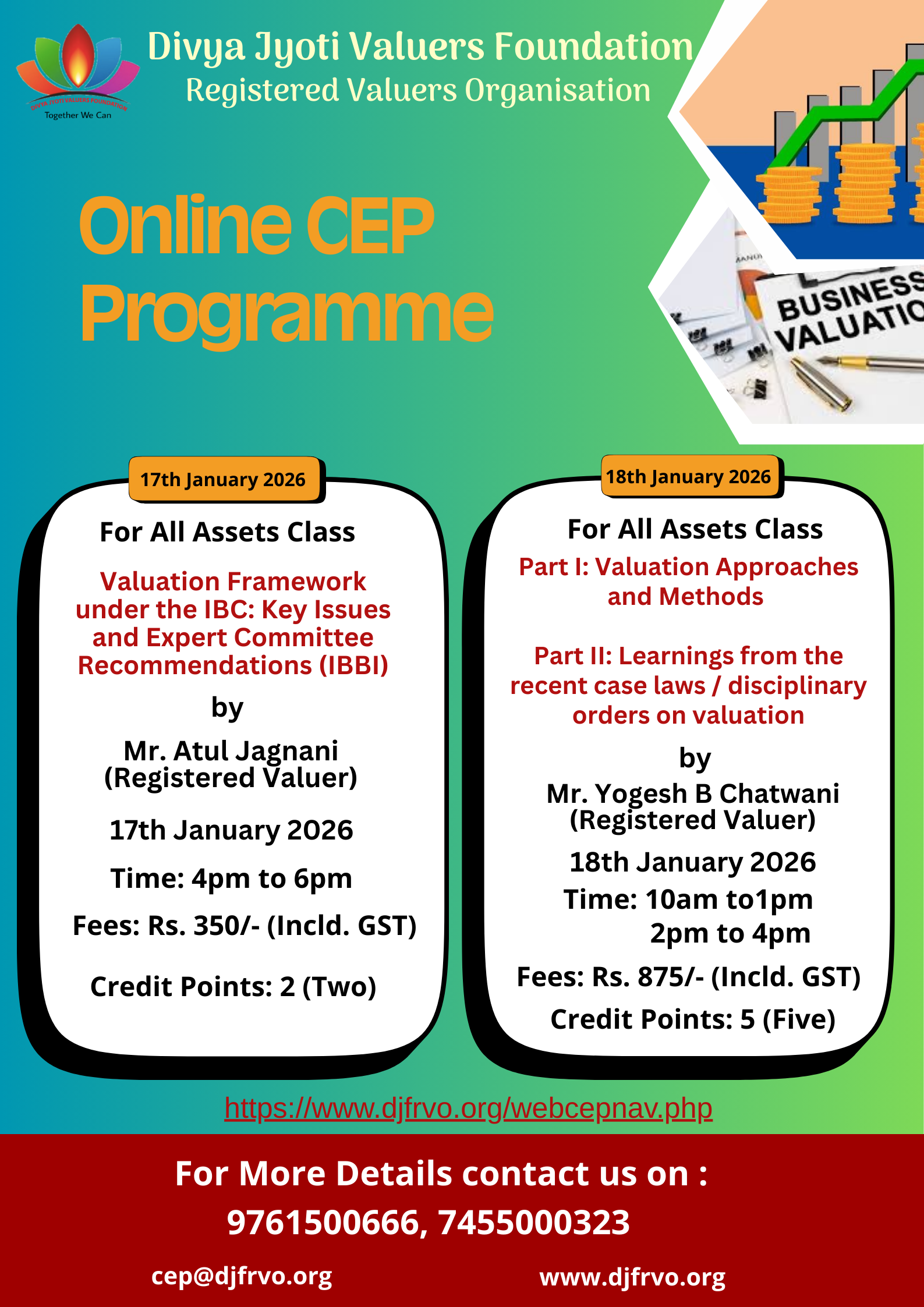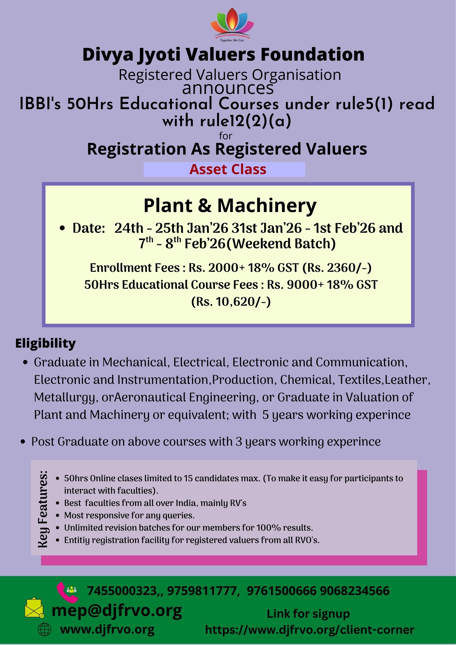 Divya Jyoti Valuers Foundation Registered Valuers Organisation Divya Jyoti Valuers Foundation (DJVF) is a company registered under the Companies Act 2013. DJVF has been recognized as Registered Valuers Organisation (RVO) by Insolvency and bankruptcy board of India(IBBI).It enrolls eligible professionals as its members. It is engaged in the development of the valuation profession and promotes the continuous professional development of its members. It monitors and regulates the activities of its member registered valuers and continuously improves upon its internal regulations and guidelines to ensure that the high standard of professional and ethical conduct is maintained by its members. It has been approved by IBBI under following all three classes of Assets: 1. Land & Building 2. Plant & Machinery 3. Securities or Financial Assets A professional who would like to pursue valuation profession as his or her career, has to undergo 50 Hrs Compulsory Educational Program conducted by RVO as per the syllabus provided by IBBI, in the category chosen by him/her to become a Registered Valuer according to Section 247, of The Companies Act, 2013.We at DJVF RVO are conducting the above course at various centers indicated in this website. As permitted by IBBI in view of the Covid pandemic, we are conducting online classes for 50hrs Mandatory Educational programme (MEP), f