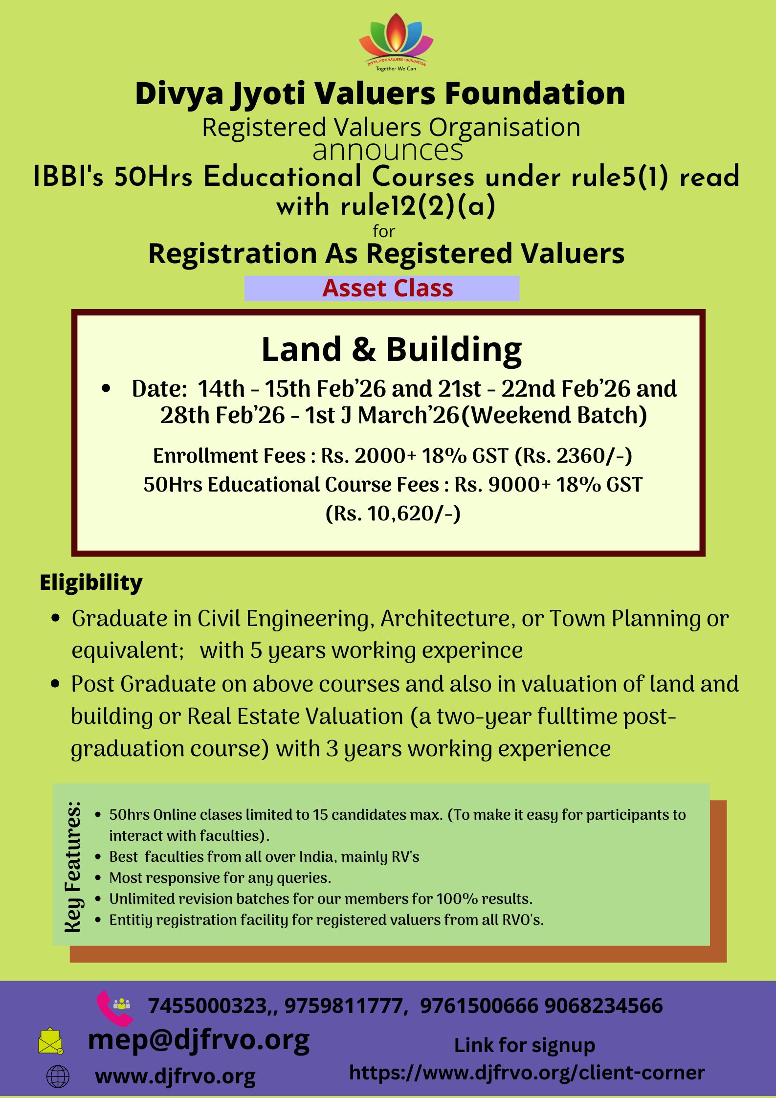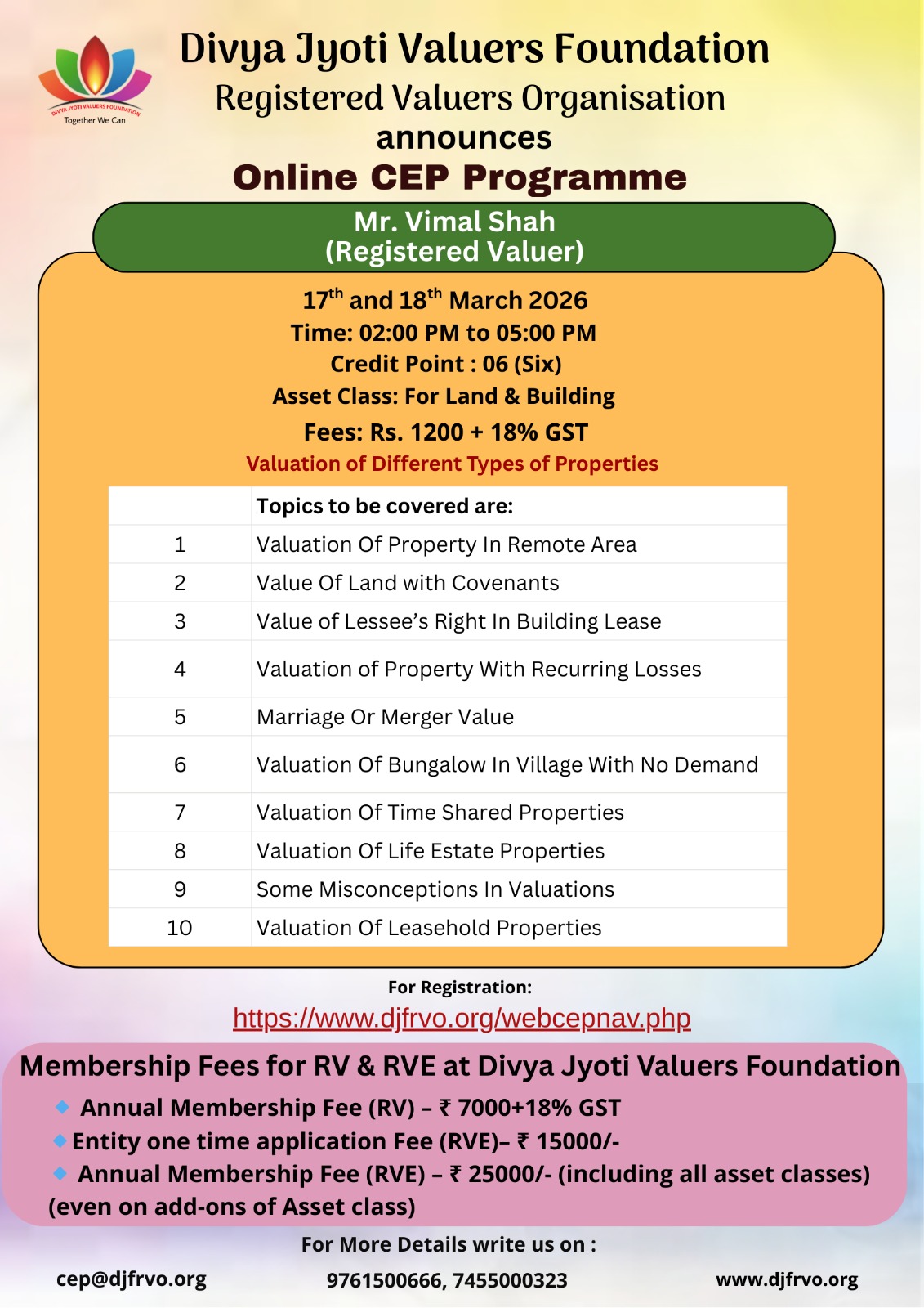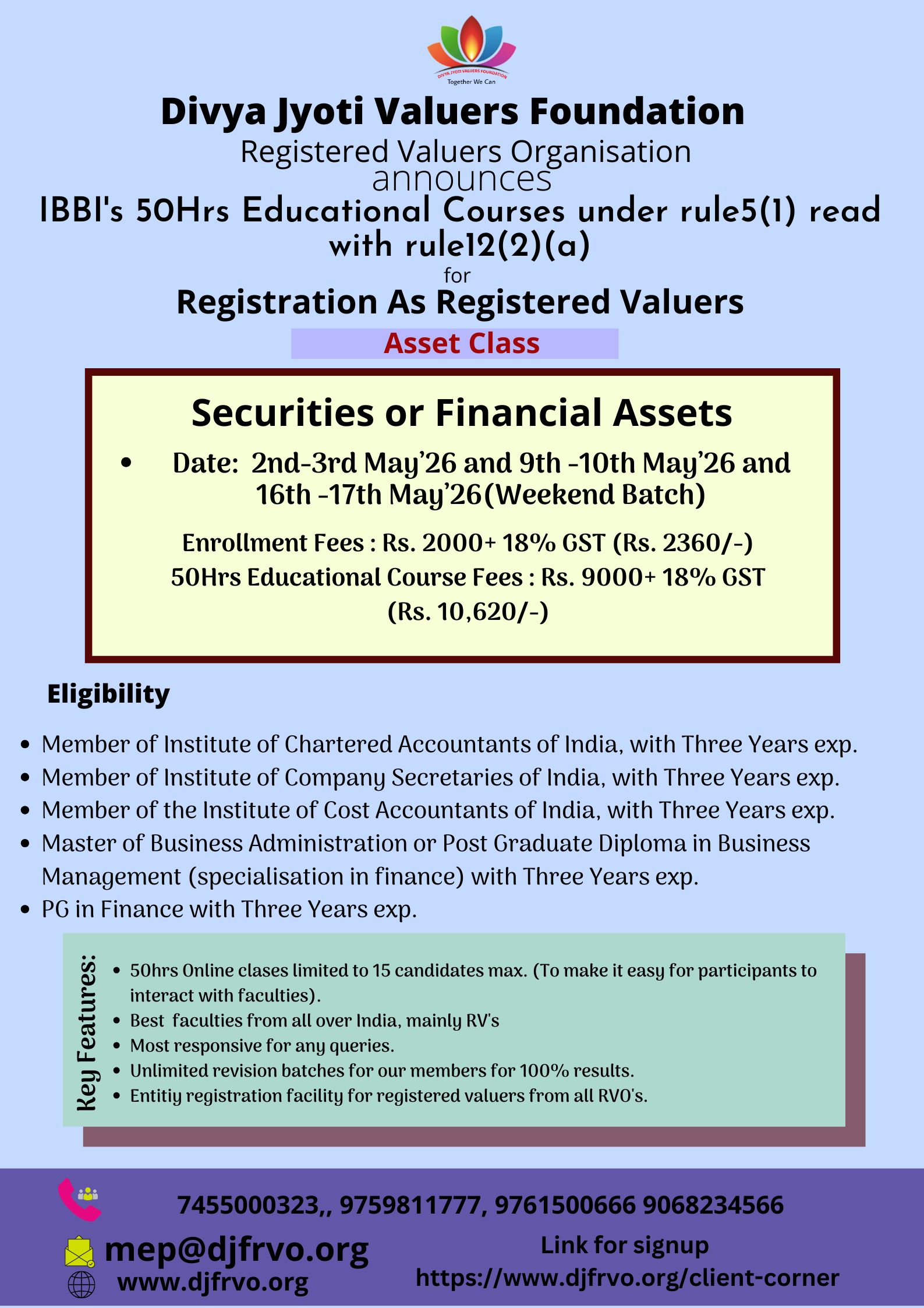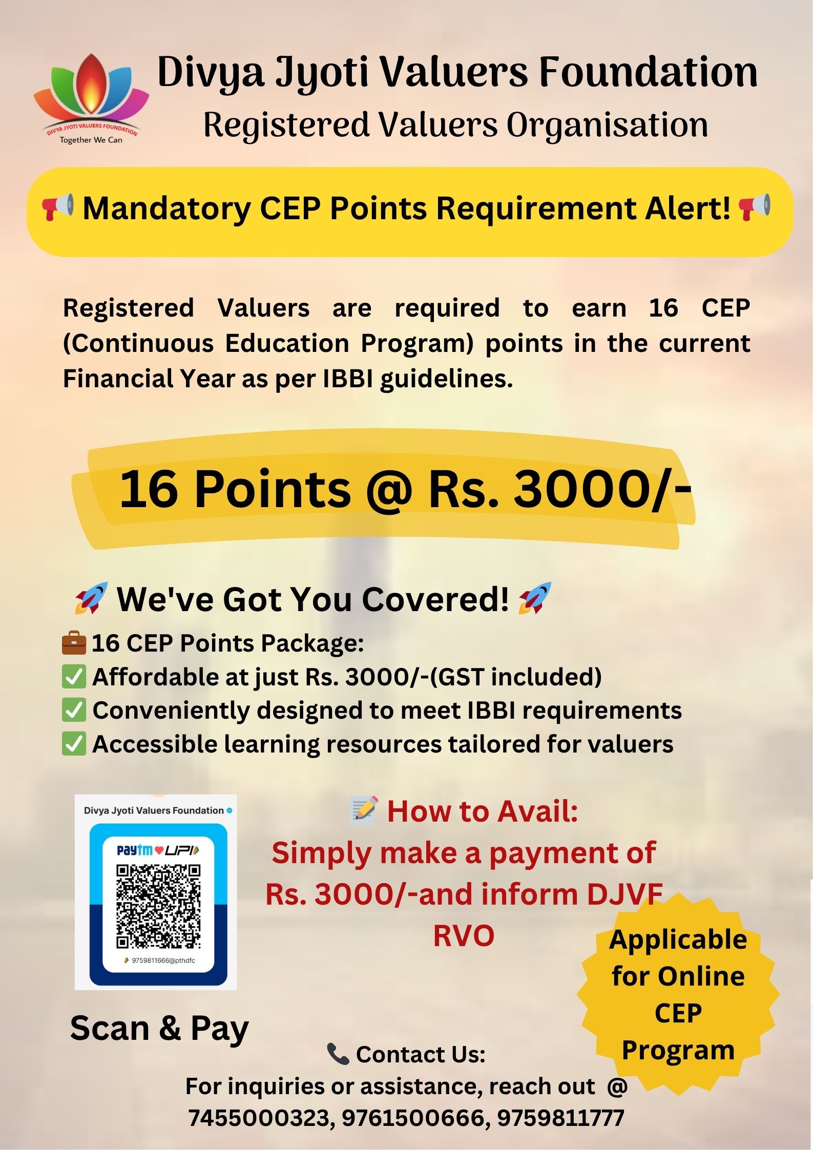 Divya Jyoti Valuers Foundation Registered Valuers Organisation Divya Jyoti Valuers Foundation (DJVF) is a company registered under the Companies Act 2013. DJVF has been recognized as Registered Valuers Organisation (RVO) by Insolvency and bankruptcy board of India(IBBI).It enrolls eligible professionals as its members. It is engaged in the development of the valuation profession and promotes the continuous professional development of its members. It monitors and regulates the activities of its member registered valuers and continuously improves upon its internal regulations and guidelines to ensure that the high standard of professional and ethical conduct is maintained by its members. It has been approved by IBBI under following all three classes of Assets: 1. Land & Building 2. Plant & Machinery 3. Securities or Financial Assets A professional who would like to pursue valuation profession as his or her career, has to undergo 50 Hrs Compulsory Educational Program conducted by RVO as per the syllabus provided by IBBI, in the category chosen by him/her to become a Registered Valuer according to Section 247, of The Companies Act, 2013.We at DJVF RVO are conducting the above course at various centers indicated in this website. As permitted by IBBI in view of the Covid pandemic, we are conducting online classes for 50hrs Mandatory Educational programme (MEP), f