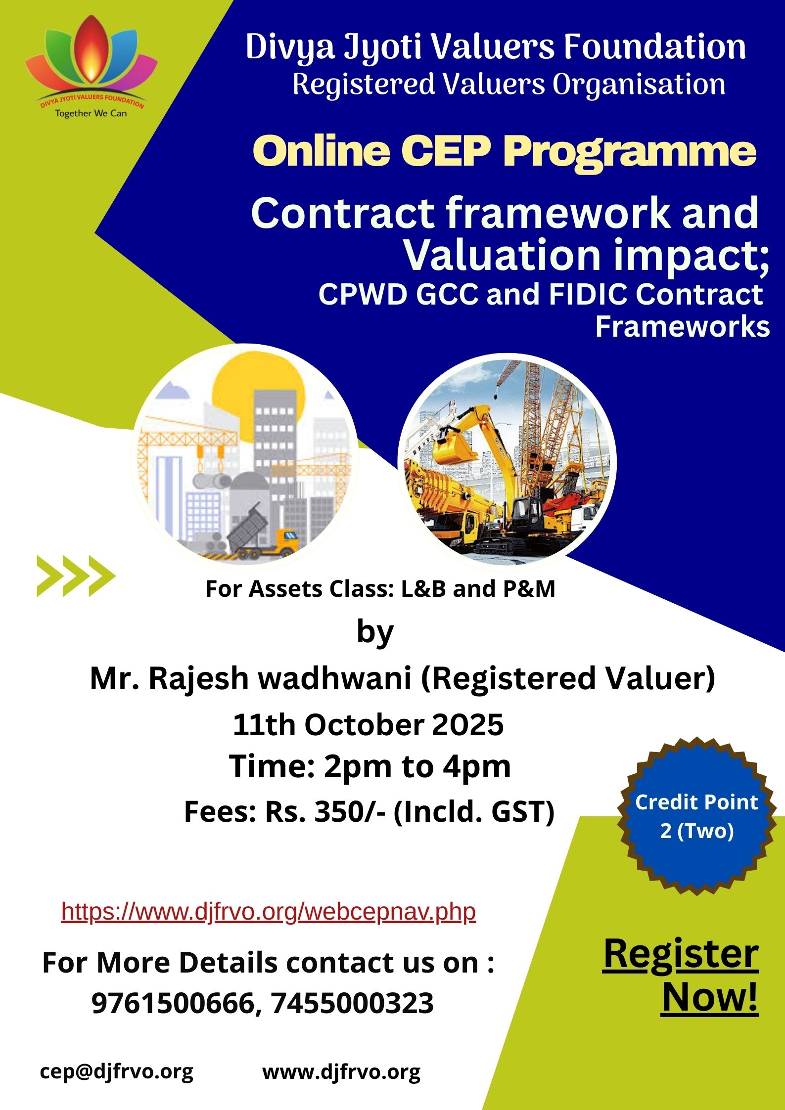 Divya Jyoti Valuers Foundation Registered Valuers Organisation Divya Jyoti Valuers Foundation (DJVF) is a company registered under the Companies Act 2013. DJVF has been recognized as Registered Valuers Organisation (RVO) by Insolvency and bankruptcy board of India(IBBI).It enrolls eligible professionals as its members. It is engaged in the development of the valuation profession and promotes the continuous professional development of its members. It monitors and regulates the activities of its member registered valuers and continuously improves upon its internal regulations and guidelines to ensure that the high standard of professional and ethical conduct is maintained by its members. It has been approved by IBBI under following all three classes of Assets: 1. Land & Building 2. Plant & Machinery 3. Securities or Financial Assets A professional who would like to pursue valuation profession as his or her career, has to undergo 50 Hrs Compulsory Educational Program conducted by RVO as per the syllabus provided by IBBI, in the category chosen by him/her to become a Registered Valuer according to Section 247, of The Companies Act, 2013.We at DJVF RVO are conducting the above course at various centers indicated in this website. As permitted by IBBI in view of the Covid pandemic, we are conducting online classes for 50hrs Mandatory Educational programme (MEP), f